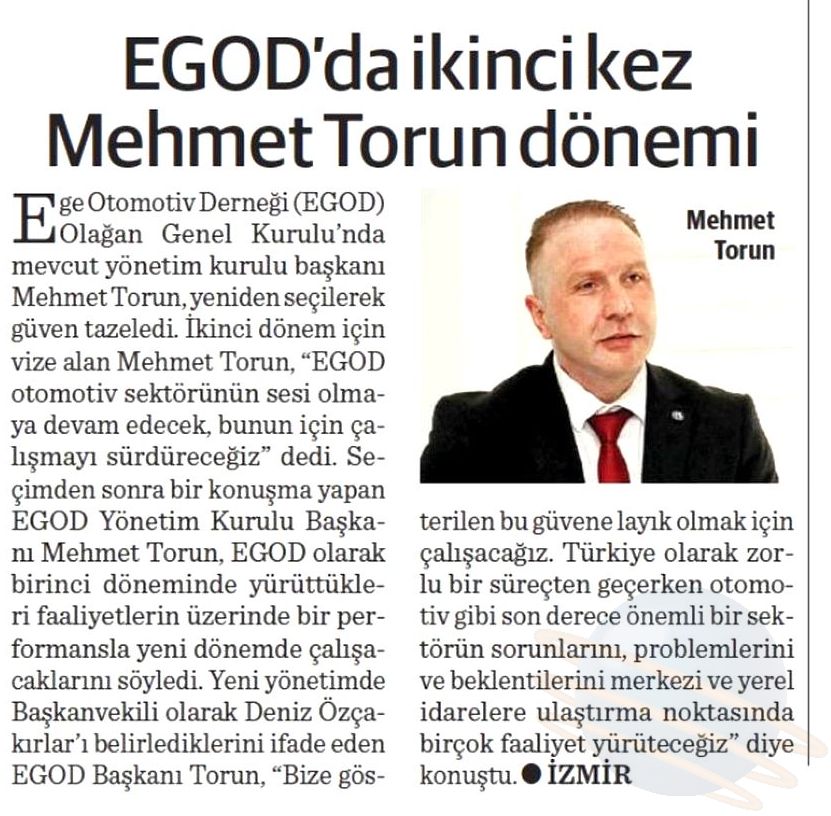 Dünya Gazetesi 03.04.2024 - EGOD'da İkinci Kez Mehmet Torun Dönemi