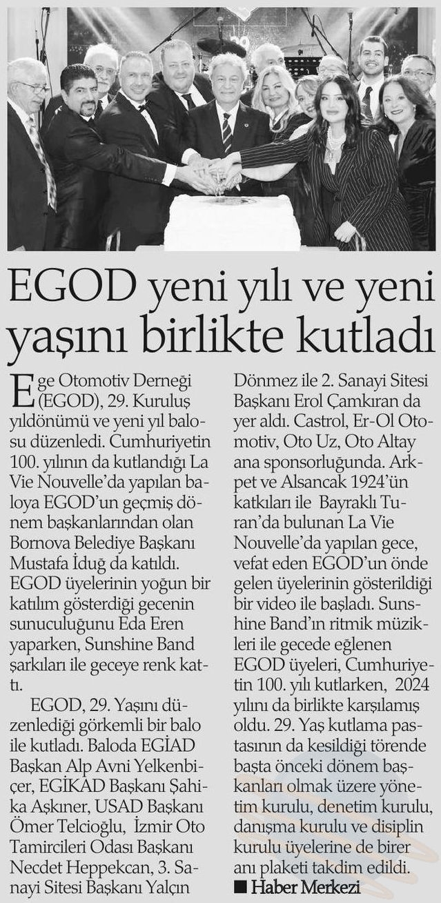Castrol, Er-Ol Otomotiv, Oto Uz, Oto Altay ana sponsorluÄŸunda. Arkpet ve Alsancak 1924'ün katkıları ile Bayraklı Turan'da bulunan La Vie Nouvelle'da yapılan gece, vefat eden EGOD'un önde gelen üyelerinin gösterildiÄŸi bir video ile baÅŸladı. Sunshine Band'ın ritmik müzikleri ile gecede eÄŸlenen EGOD üyeleri, Cumhuriyetin 100. yılı kutlarken, 2024 yılını da birlikte karşılamış oldu. 29. YaÅŸ kutlama pastasının da kesildiÄŸi törende baÅŸta önceki dönem baÅŸkanlan olmak üzere yönetim kurulu, denetim kurulu, danışma kurulu ve disiplin kurulu üyelerine de birer anı plaketi takdim edildi.
