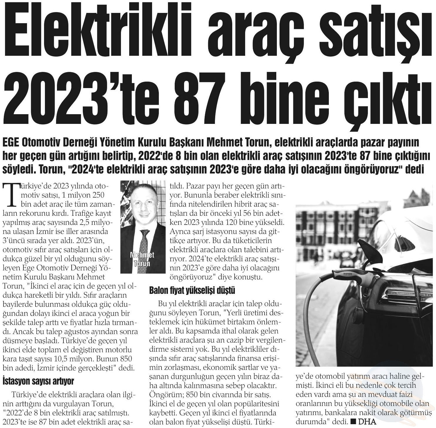 EGE Otomotiv Demeği Yönetim Kurulu Başkam Mehmet Torun, elektrikli araçlarda pazar payının her geçen gün artığını belirtip, 2022 de 8 bin olan elektrikli araç satışının 2023 te 87 bine çıktığını söyledi.