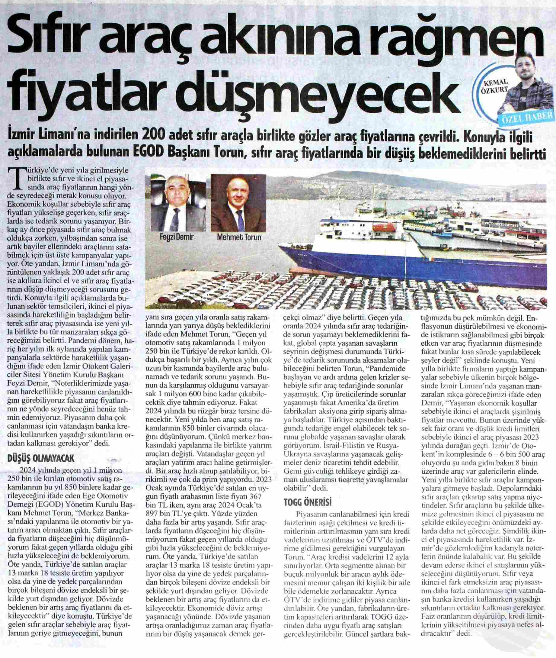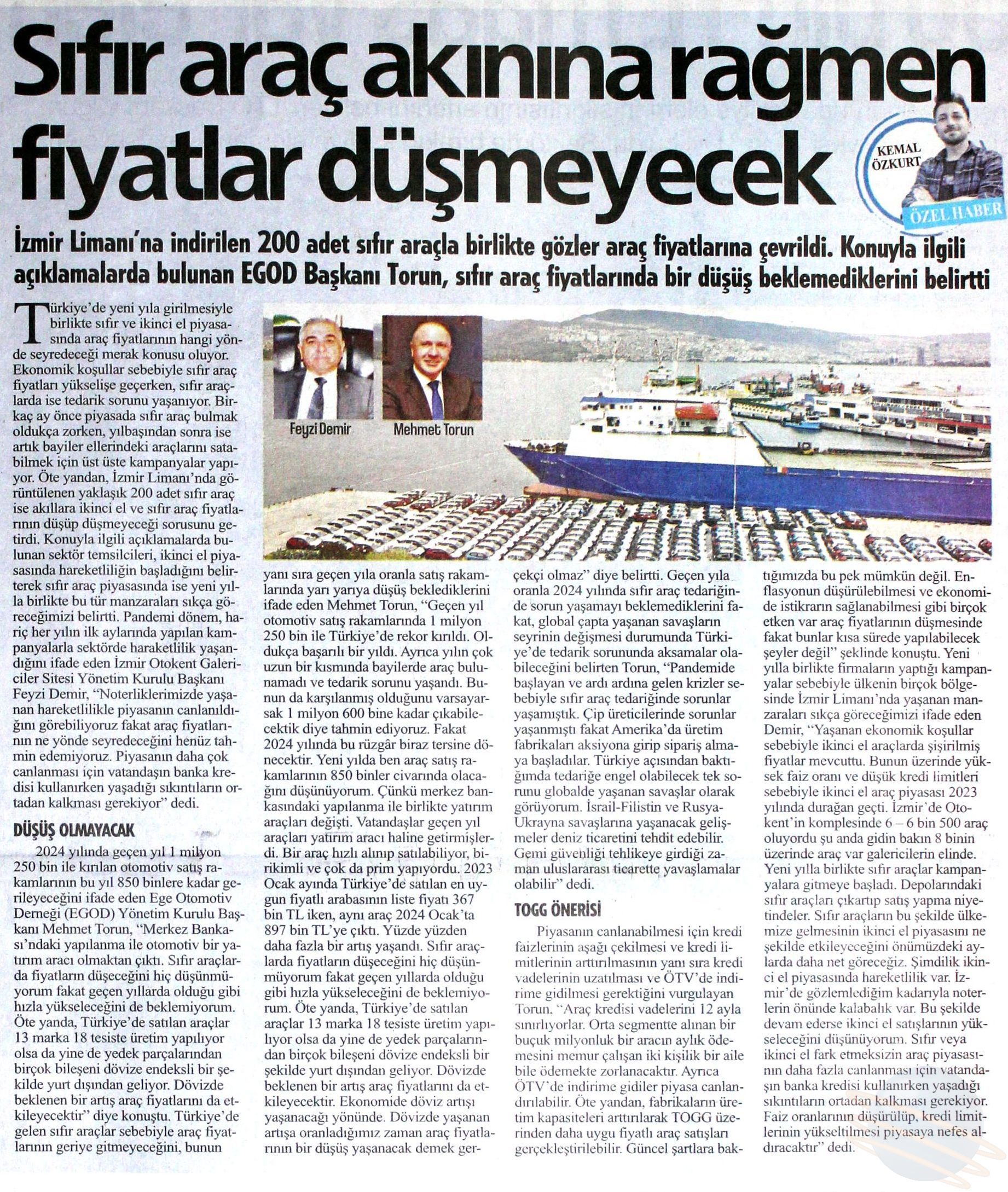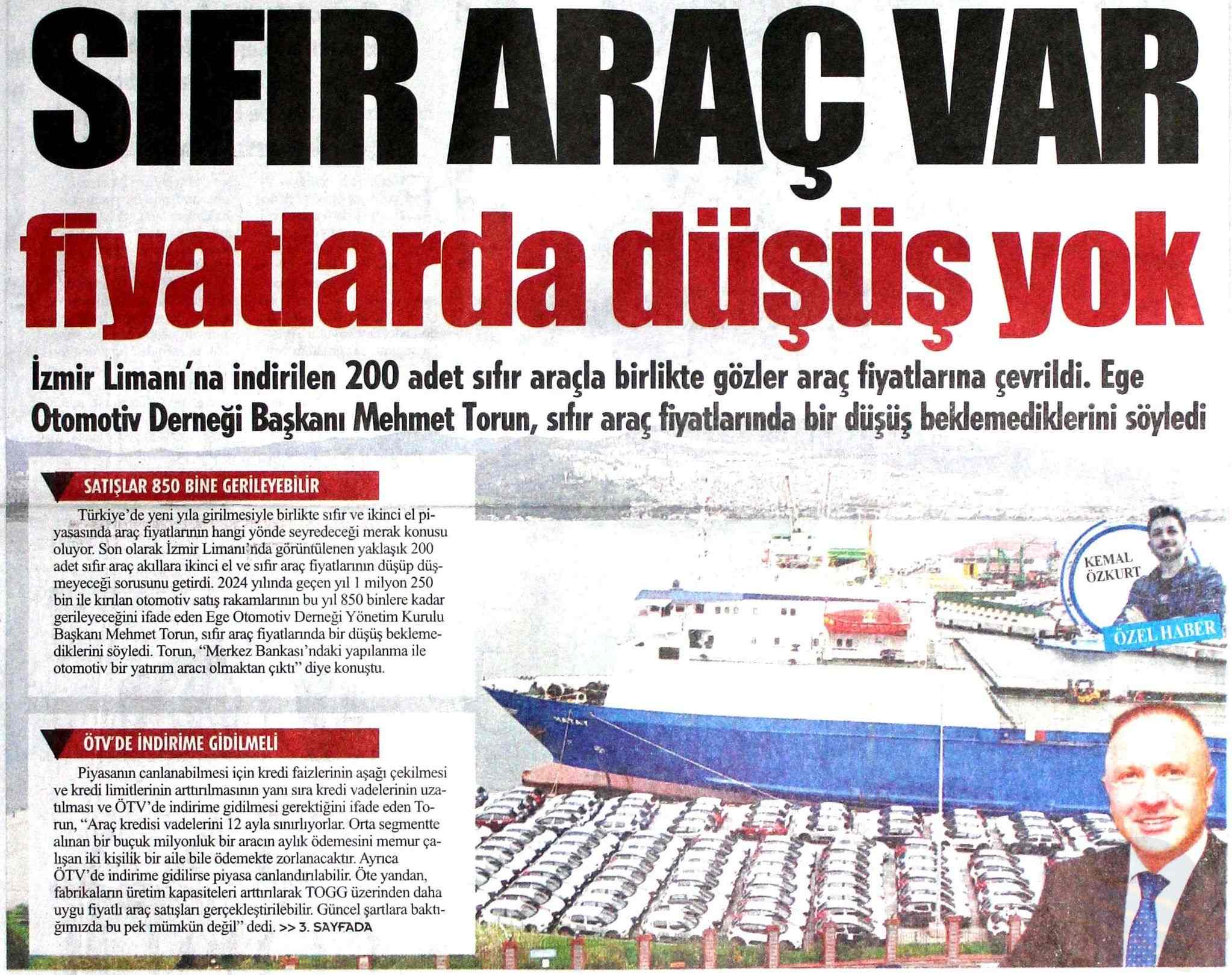 Türkiye'de yeni yıla girilmesiyle birlikte sıfir ve ikinci el piyasasında araç fiyatlarının hangi yönde seyredeceÄŸi merak konusu oluyor. Son olarak İzmir Limanı'nda görüntülenen yaklaşık 200 adet sıfir araç akıllara ikinci el ve sıfir araç fiyatlarının düÅŸüp düÅŸmeyeceÄŸi sorusunu getirdi. 2024 yılında geçen yıl 1 milyon 250 bin ile kırılan otomotiv satış rakamlarının bu yıl 850 binlere kadar gerileyebileceÄŸini ifade eden Ege Otomotiv DemeÄŸi Yönetim Kurulu BaÅŸkanı Mehmet Torun, sıfir araç fiyatlarında bir düÅŸüÅŸ beklemediklerini söyledi. Torun, "Merkez Bankası'ndaki yapılanma ile otomotiv bir yatırım aracı olmaktan çıktı" diye konuÅŸtu.
